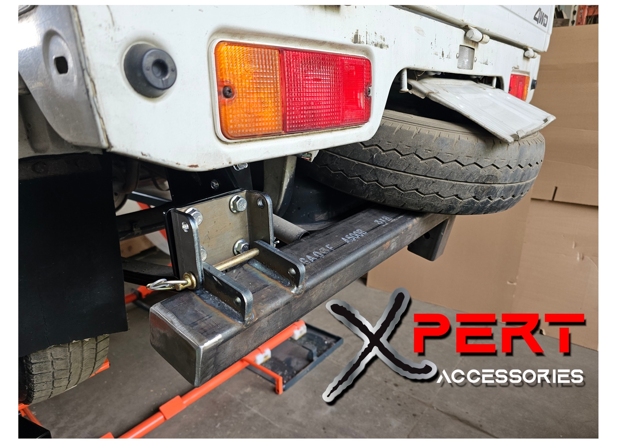 Suzuki Carry DD51T Rear Baird Bumper. The New DD51 Baird Bumper allows you to maintain full access to your factory spare and keep your flip-up license plate as is. Bumper is fully removeable and has a receiver hitch.